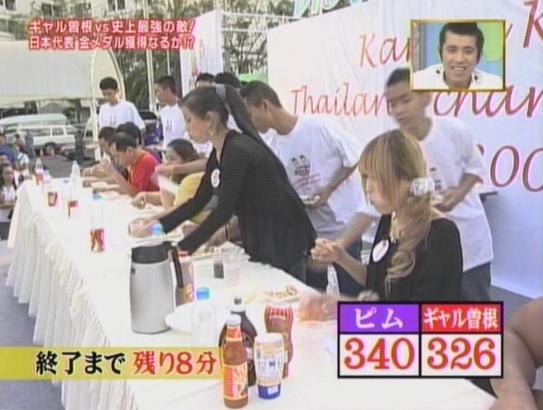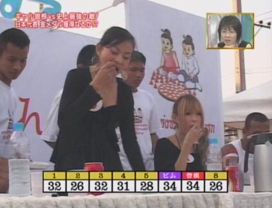 お昼くらいに、ギャル曽根がタイの大食い女王に挑むという特番がやってましたよ。
