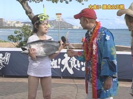なぜかマグロを持って水着で登場。この無敵のキャラクターこそが伝説の女王ですよね。