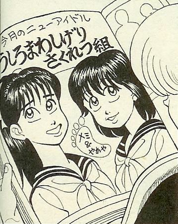 「うしろまわしげりさくれつ組」は「ハイスクール!奇面組」内で登場した、当作品のOPEDを歌う高井麻巳子と岩井由紀子(ゆうゆ)の二人組み「うしろゆびさされ組」のパロディです。アニメ版と漫画版でもちょこっと登場していますね。